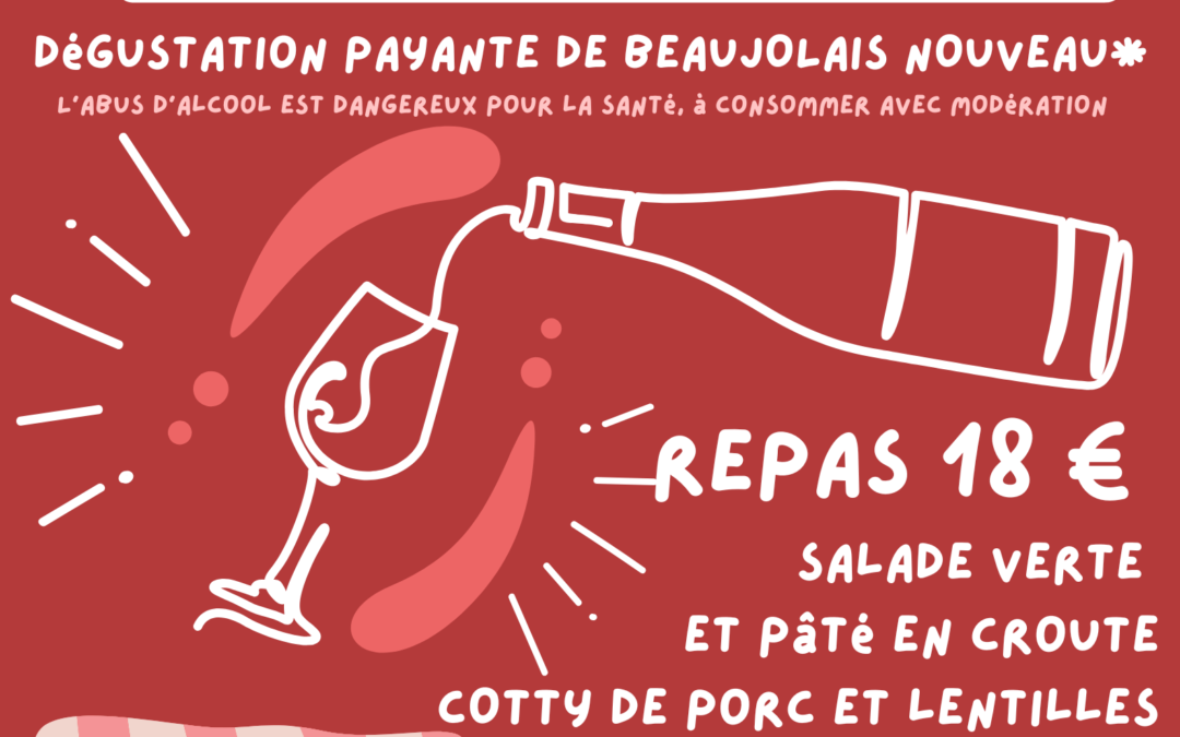 Rendez-vous le SAMEDI 22 NOVEMBRE à partir de 19h pour déguster le beaujolais nouveau, et un menu lyonnais !
